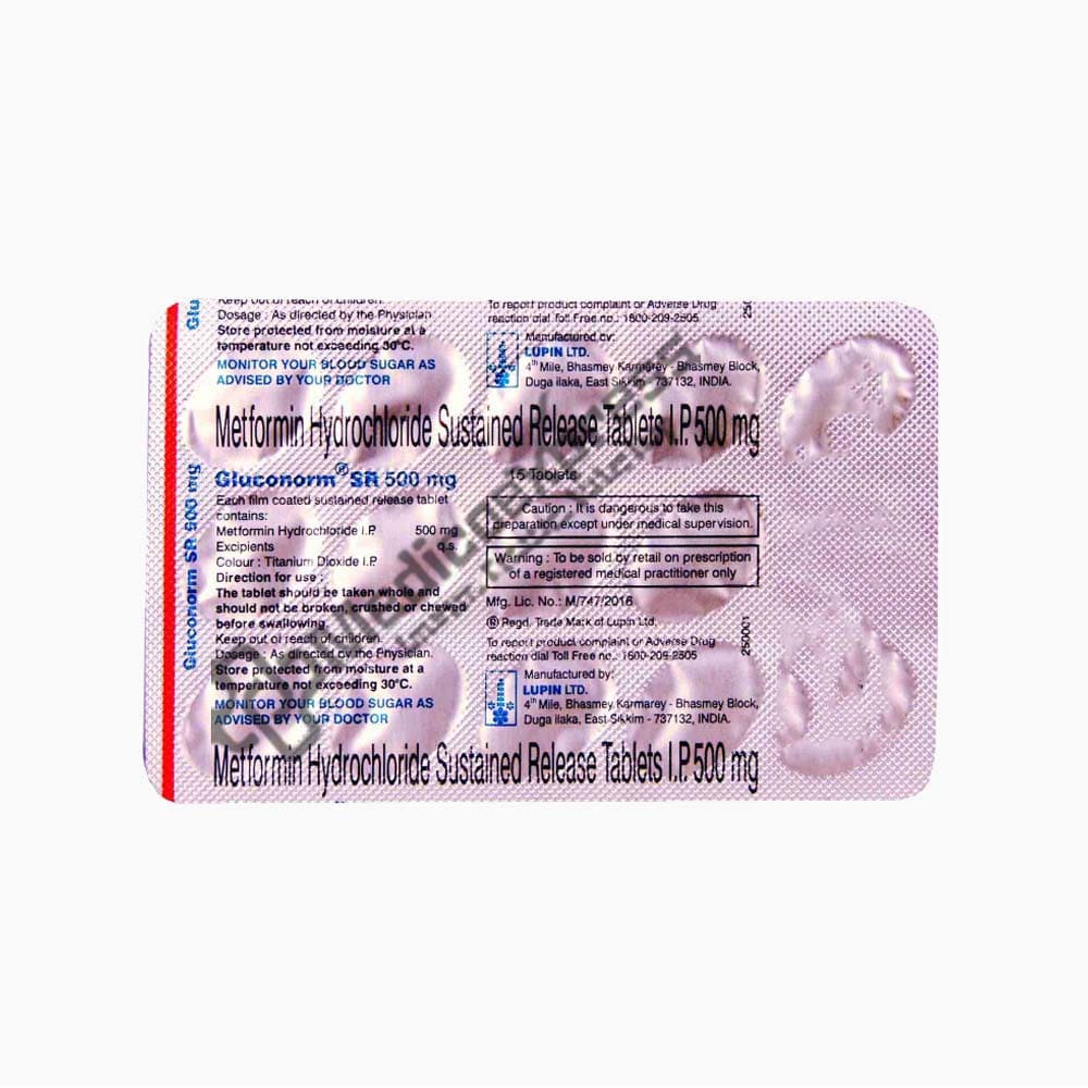 Gluconorm SR 500 mg Tablet 15's belong to Biguanides, a class of anti-diabetic drugs used to treat diabetes. belong to. It aids in reducing people with type 2 diabetes' elevated blood glucose levels. The way our bodies metabolise glucose is effected by type 2 diabetes, a chronic or lifelong condition. Insulin production is either insufficient or ineffective in people with type 2 diabetes, depending on which scenario is true (insulin resistance). Type 2 diabetes, sometimes referred to as adult-onset diabetes, is most frequently experienced by middle-aged or older people. When diet and exercise alone are not sufficient to regulate blood sugar levels in people with type 2 diabetes, Gluconorm SR 500 mg Tablet 15's are given.Disclaimer:For more information contact your physician.
