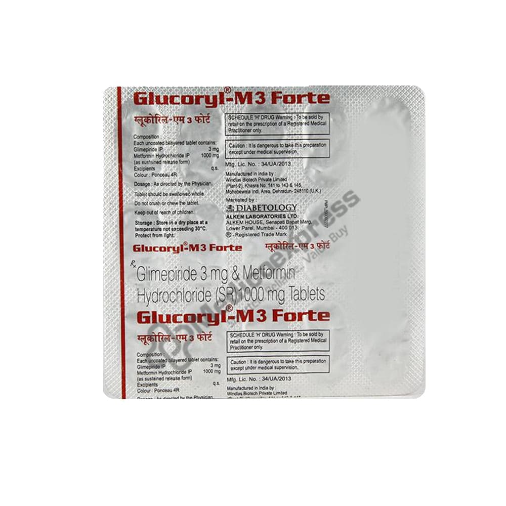 Glucoryl-M3 Tablet 15s, are used to treat type 2 diabetes, particularly in people whose blood sugar levels cannot be maintained by diet and exercise alone. Type 2 diabetes affects how our bodies metabolise glucose and is a chronic (long-lasting) disorder. In people with type 2 diabetes, the amount of insulin produced is either insufficient or the insulin cannot work properly in the body (insulin resistance). Glimepiride and metformin are the two anti-diabetic medications included in Glucoryl-M3 Tablet 15's. The way glimepiride works is by activating the pancreatic beta cells that make insulin. As a result, insulin aids in the elimination of blood sugar.Disclaimer:For more information contact your physician.