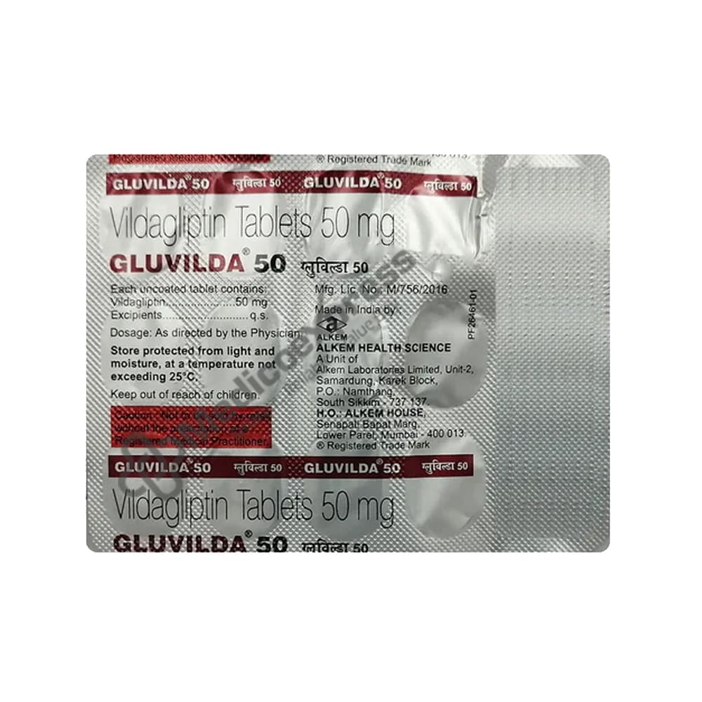 Gluvilda 50 Tablet 15s is a member of the group of anti-diabetic medications known as "dipeptidyl peptidase 4 (DPP-4) inhibitors" that is used to treat type 2 diabetes, particularly in people whose blood sugar levels are not under control with diet and exercise alone. Gluvilda 50 Tablet 15s may be taken either on its own or in conjunction with other drugs. The way our bodies metabolise glucose is impacted by type 2 diabetes, a chronic (long-lasting) disorder. People with type 2 diabetes either create insufficient amounts of insulin or are unable to use it as it should in the body (insulin resistance). Type 2 diabetes, sometimes referred to as adult-onset diabetes, is most common in people in their middle years or older.Disclaimer:For more information contact your physician.