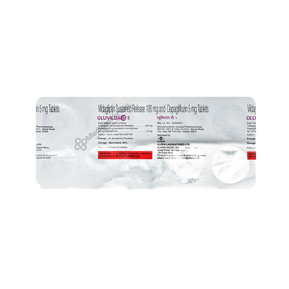 Gluvilda D 5mg Tablets 10's aids in blood sugar regulation. When combined with diet and exercise, this medication helps persons with type 2 diabetes mellitus better control their blood sugar levels. It aids in appropriate insulin usage, which lowers blood sugar levels. You can take Gluvilda D 5mg Tablet 10's anytime of the day with or without food, but you should aim to take it at the same time each day. Your doctor will choose the dosage. Don't stop taking it before consulting your physician. If you do, your blood sugar levels might rise and you'd be more likely to get severe side effects including kidney damage or blindness.Disclaimer:For more information contact your physician.