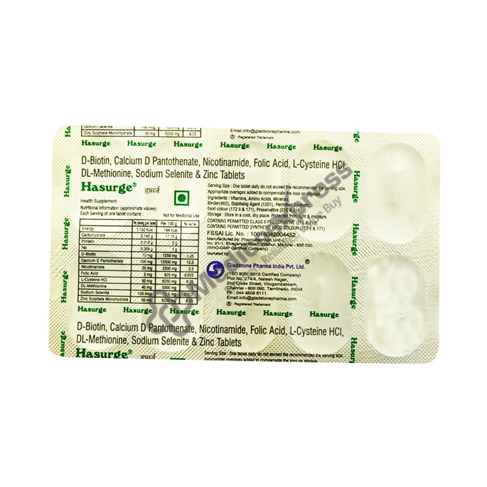 Hasurge tablet is a dietary supplement that contains vitamins + minerals + and amino acids to help prevent hair loss.Disclaimer:For More Information Contact Your Physician