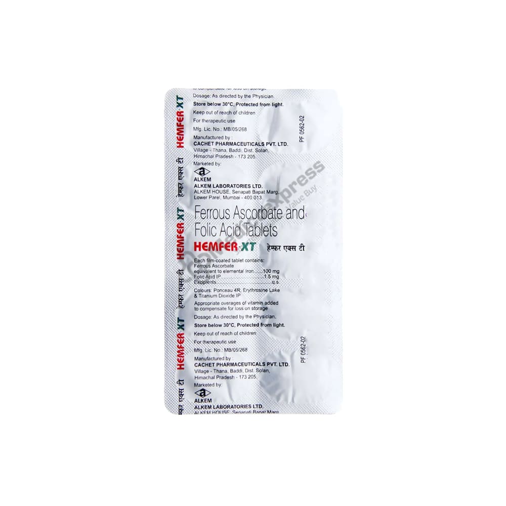 Hemfer-XT Tablet 10's are part of a class of drugs known as "haematinics," which are primarily used to treat anaemia (lack of blood), which is primarily brought on by a poor diet, insufficient food absorption, or high folate consumption in the body (in pregnancy). Anaemia is a disorder when the body lacks enough red blood cells to provide the necessary oxygen to the body's various tissues.Ferrous ascorbate (an iron supplement) and folic acid are the two medications included in Hemfer-XT Tablet 10's (a form of vitamin B9). Hemfer-XT Tablet 10's act by boosting the body's production of haemoglobin, a protein, and red blood cells (RBC). As a result, the body produces an acceptable amount of RBC, ensuring that every tissue has access to an adequate amount of oxygen.Disclaimer:For more information contact your physician.
