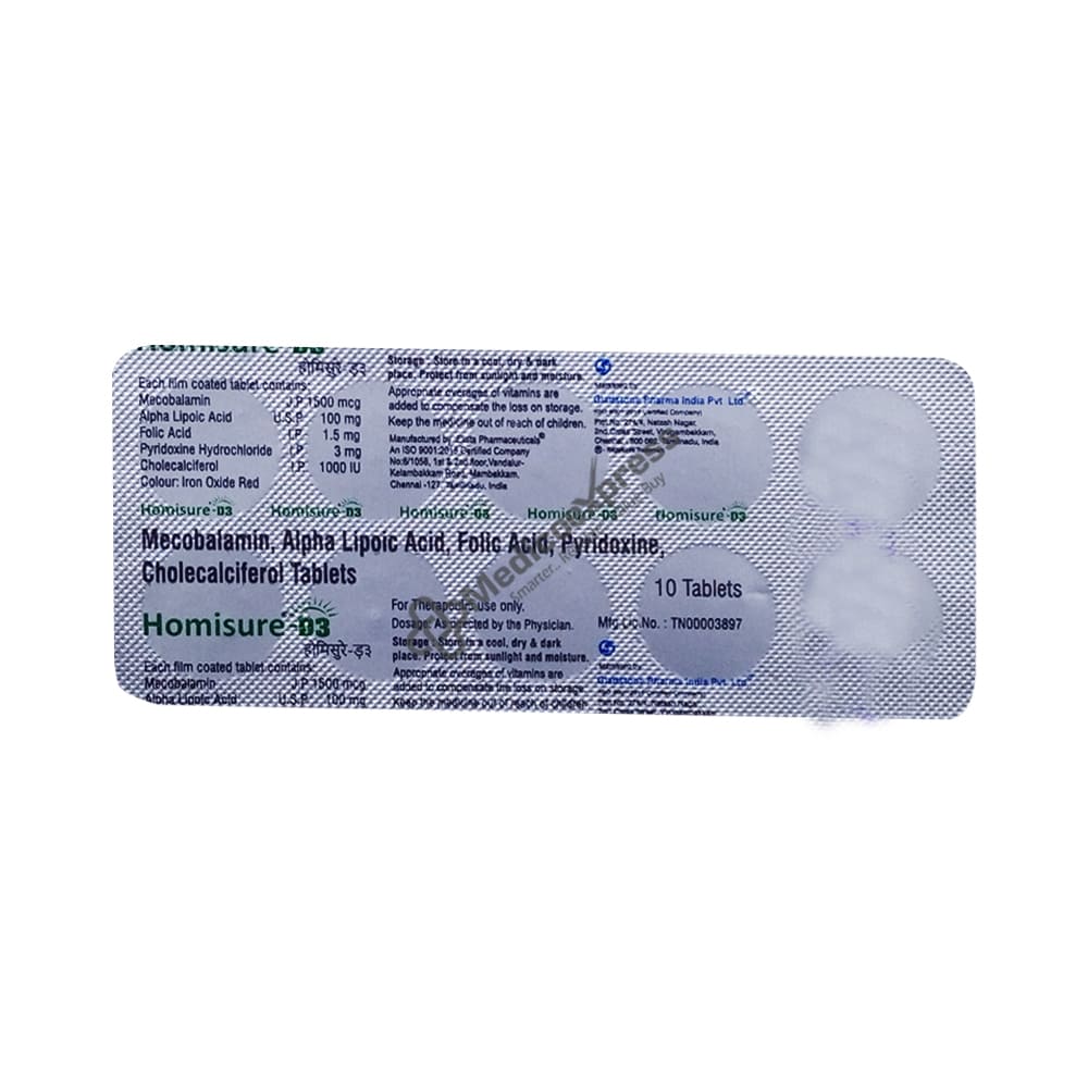 Homisure D3 Strip Of 10 Tablet is used to replenish Vitamins in the body. Its major/active components are folic acid (5mg) + methylcobalamin (1500mcg) + and pyridoxine (20mg).Disclaimer:For More Information Contact Your Physician