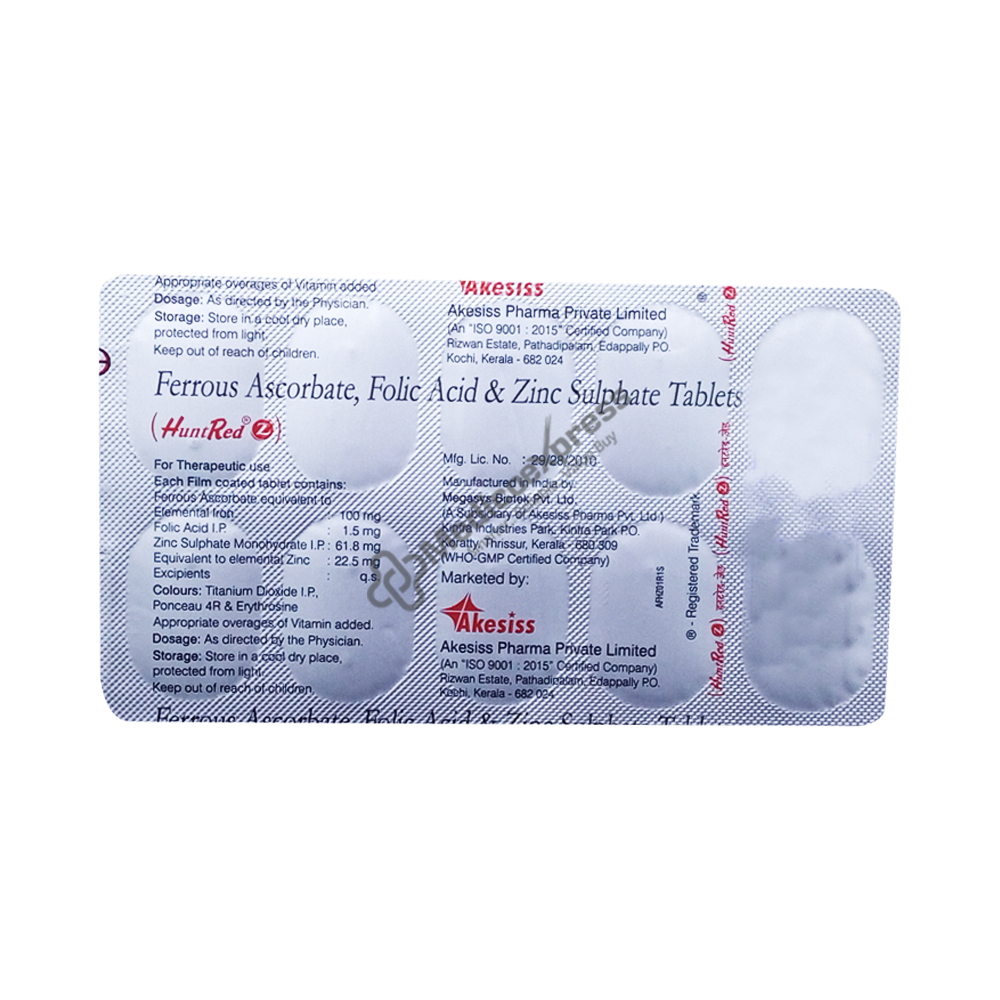 Huntred Z Tablet provides vitamin B9 (Folic acid), iron, and zinc, three vital components needed for the body to operate properly.Disclaimer:For More Information Contact Your Physician