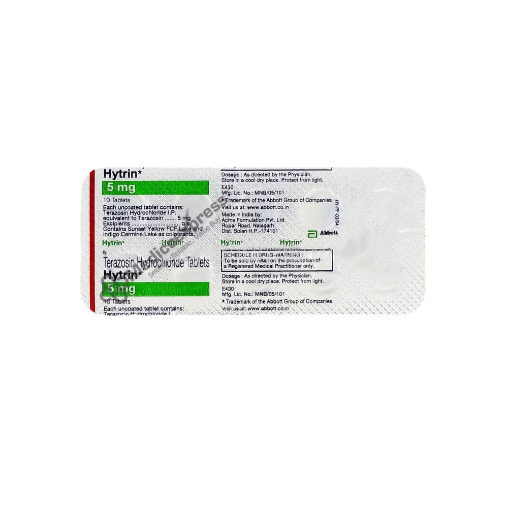 Hytrin 5 mg Tablet 10 belongs to a class of medications known as 'anti-hypertensives,' which are primarily used to treat hypertension (high blood pressure) and lower the risk of a heart attack or stroke in the future.Disclaimer:For More Information Contact Your Physician