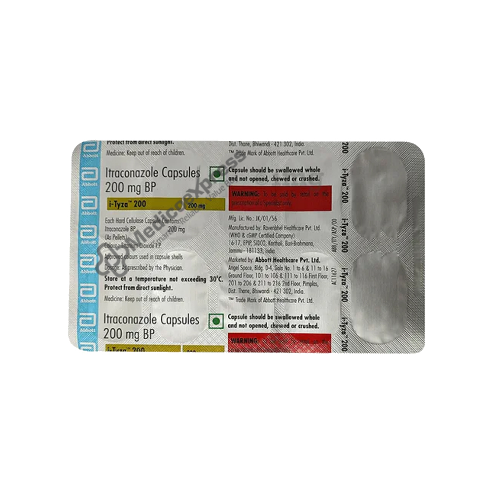 I-Tyza 200 mg Capsule 10's is a member of the class of drugs known as antifungals. It is used to treat infections of the mouth, throat, vagina, and other regions of the body, such as the fingernails and toenails, by halting the growth of fungus. By dissolving the fungal cell membrane, it eradicates fungus. I-Tyza 200 mg Capsule should only be taken for the amount of time and in the dosage that your doctor has advised. It can be taken with food and needs to be swallowed whole. Even if your symptoms go away after a few days, take this medication at regular intervals until your prescription is filled to reap the greatest benefits. If you discontinue the medication too soon, the infection could come back, and skipping doses can raise your risk of infection.Disclaimer:For more information contact your physician.