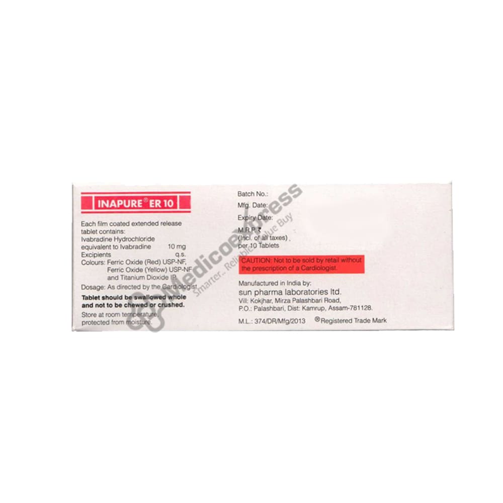 Inapure ER 10 Tablet is a prescription medication used to treat angina (heart-related chest pain) and chronic (long-term) heart failure. It improves the efficiency of the heart by lowering the heart rate. This relieves chest pain and lowers the risk of hospitalisation in patients with heart failure.Disclaimer:For More Information Contact Your Physician