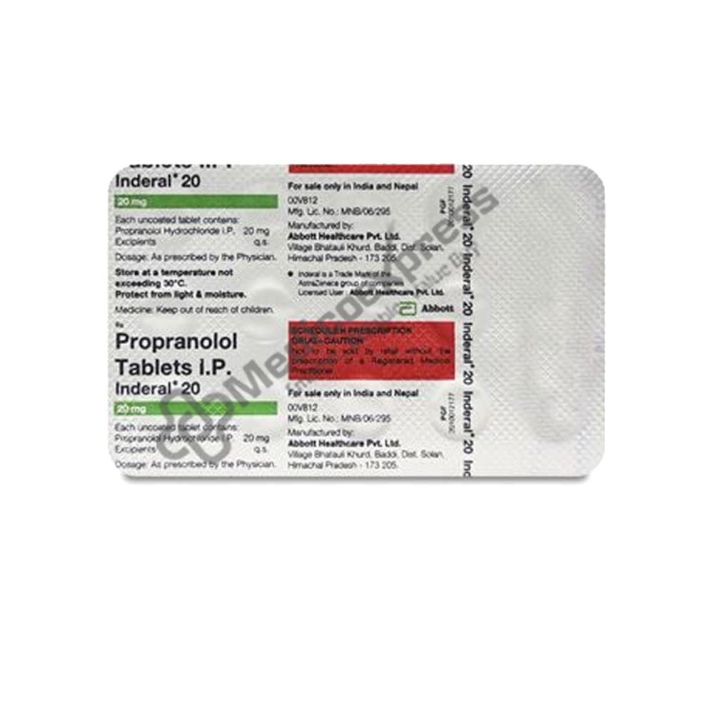 Inderal 20 Tablet 15's Belongs To a Class Of Drugs Known As Beta-Blockers, Which Are Used Alone Or In Combination With Other Medications To Treat High Blood Pressure (Hypertension), Heart-Related Chest Pain (Angina), Heart Rhythm Disorder (Arrhythmia), And Migraine Headache And Tremors Symptoms (Fits).Disclaimer:For More Information Contact Your Physician