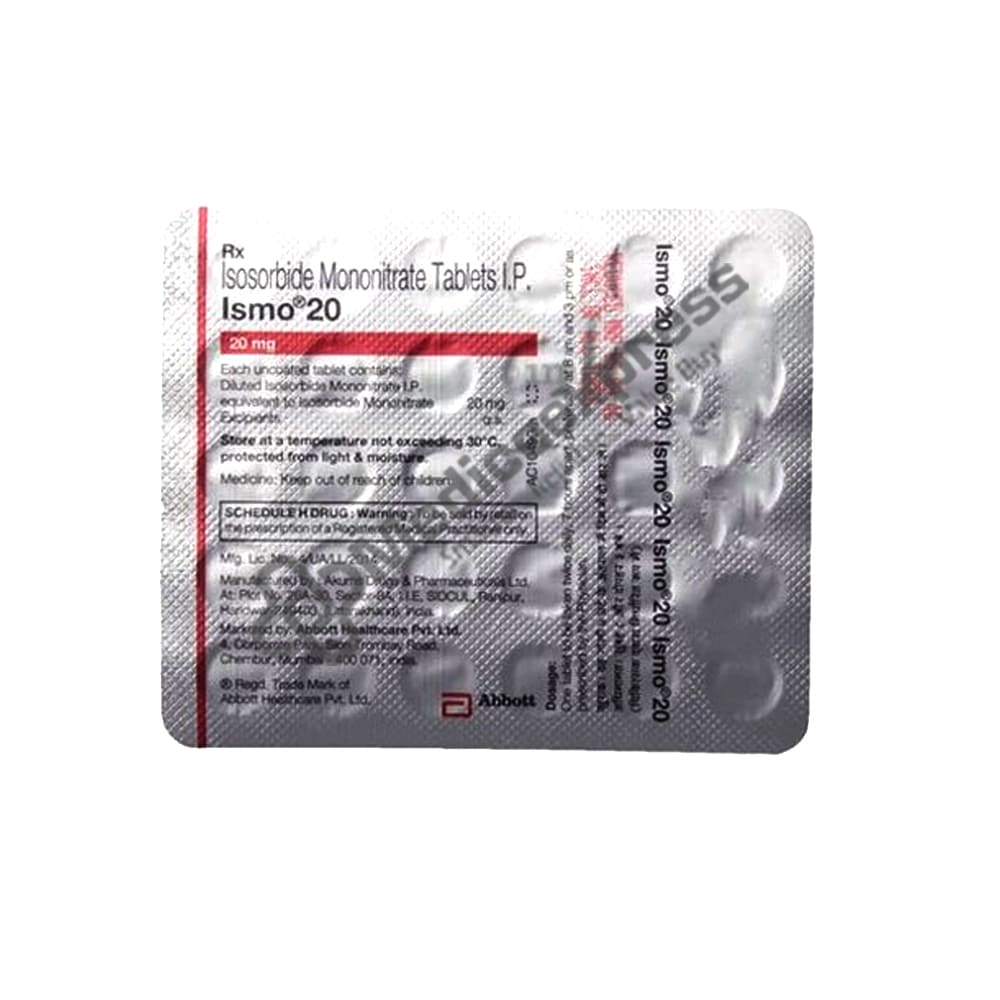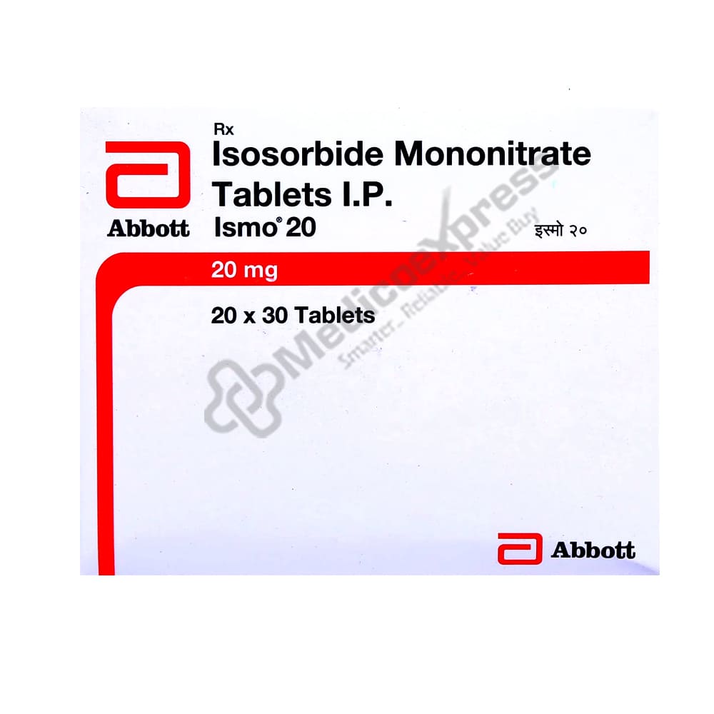 Ismo 20 Tablet 30's is an organic nitrate having blood vessel dilation action.Disclaimer:For More Information Contact Your Physician