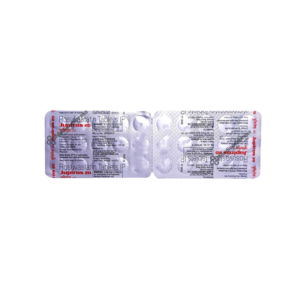 Jupiros 20mg Tablet 15'S is a member of the statin drug class. It lowers cholesterol and lowers the chance of developing heart disease. A fatty substance called cholesterol causes your blood vessels to narrow as it accumulates, which can result in a heart attack or stroke. The drug Jupiros 20 Tablet is frequently given and is thought to be safe for long-term usage. It may be consumed either before or after food. Although you can take it whenever you like, try to take it at the same time every day. The majority of people with high cholesterol do not experience any symptoms, but quitting your medication may cause your cholesterol levels to rise, worsening your condition and raising your risk of heart disease.Disclaimer:For more information contact your physician.