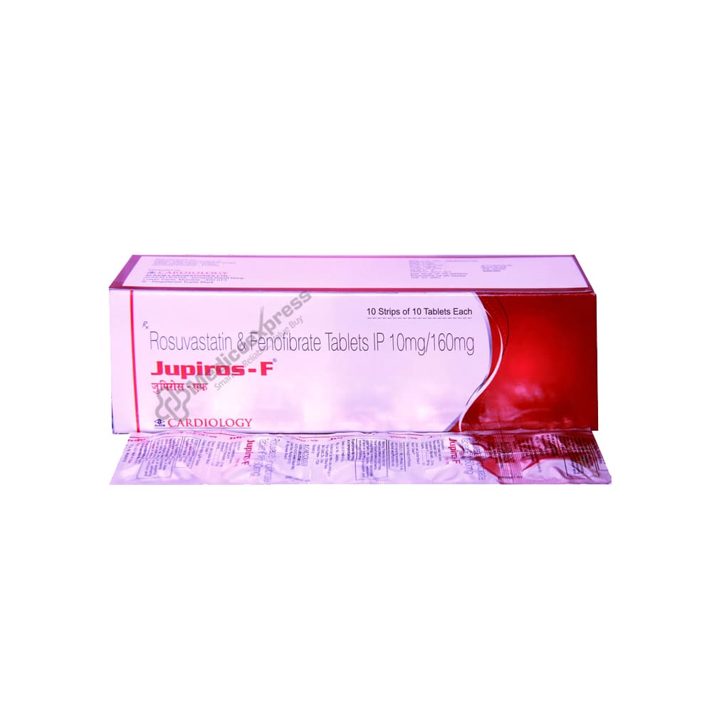 Jupiros F Tablet 10's are a type of lipid-lowering medication intended to reduce high levels of total cholesterol (TC) and triglycerides (TG). This lowers the risk of future cardiovascular events such heart attacks, strokes, and angina (chest discomfort caused by the heart). The build-up of fat, cholesterol, and other waxy substances layers creating a plaque in the lining of the arteries wall is what causes the blockage of the heart. This is caused by an elevated level of bad cholesterol (low-density lipoprotein, or LDL, and triglycerides, or TG) (coronary arteries). A blood clot and a heart attack are more likely to occur as a result.Disclaimer:For more information contact your physician.