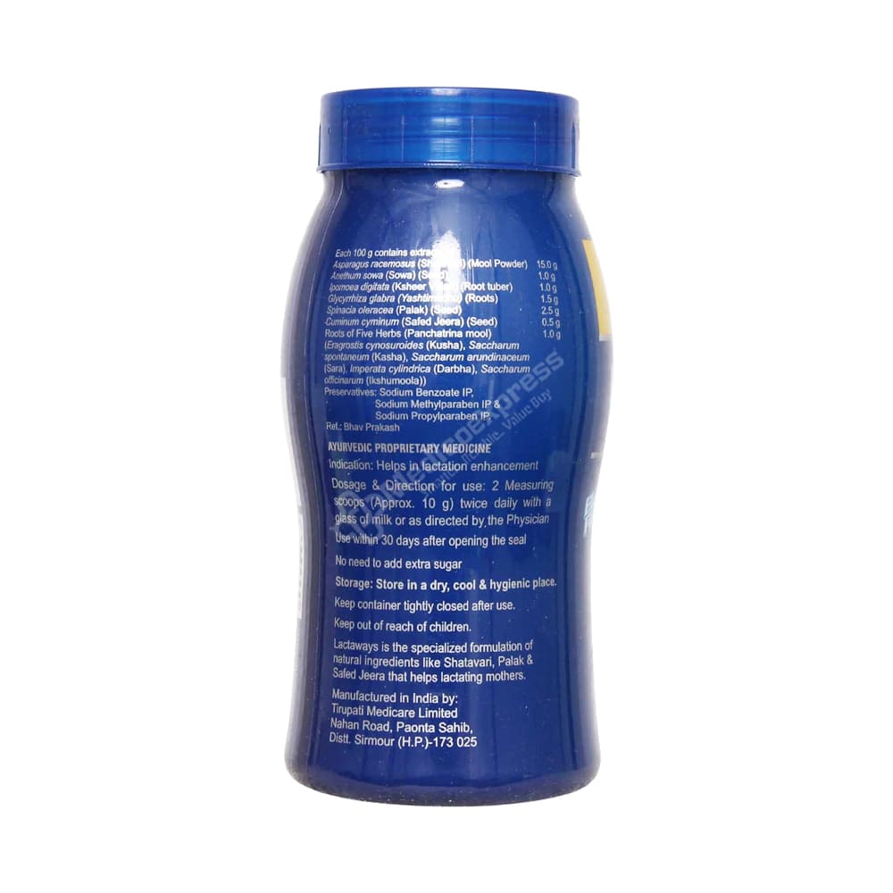 Lactaways granules are ayurvedic granules that contain a variety of dietary and medicinal ingredients. The granules aid in the production of breast milk in mothers.Disclaimer:For more information contact your physician