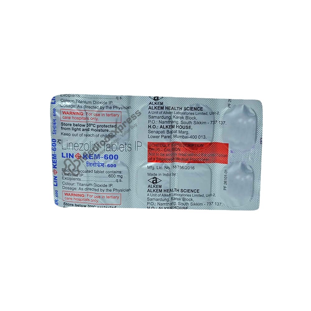 Linokem 600mg Tablet 10'S contains Linezolid, which is a member of the class of drugs known as antibiotics. It is used to treat bacterial infections such pneumonia (nosocomial and community-acquired pneumonia), certain infections in or under the skin (complicated skin and soft tissue infections), and blood infections. The growth of particular dangerous bacterial strains everywhere in the body results in bacterial infections. It is typically characterised by a fever, chills, and sweats, swollen lymph nodes, abrupt pain or its worsening, inexplicable exhaustion, headache, skin flushing or discomfort, nausea, vomiting, diarrhoea, or stomach pain.Disclaimer:For more information contact your physician.