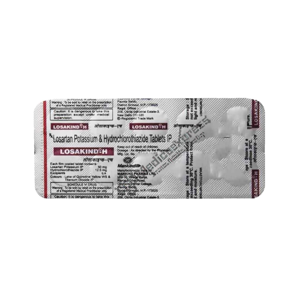 Losakind-H Tablet 10s are one of a group of medications known as anti-hypertensives, which are generally used to treat hypertension (high blood pressure) and lower the risk of stroke in people with the condition. A combination drug called Losakind-H Tablet 10's is typically used when a single prescription is inadequate to treat high blood pressure. A lifelong or chronic illness known as hypertension or high blood pressure occurs when there is an excessive amount of force being applied to the arterial wall. It raises the possibility of developing heart conditions like heart attack and stroke. Angiotensin II receptor antagonist Losartan and hydrochlorothiazide are combined in Losakind-H Tablets, a dosage form (thiazide diuretic or water pill). Angiotensin receptor blockers like losartan aid to relax and expand the arteries for simple blood flow.Disclaimer:For more information contact your physician.