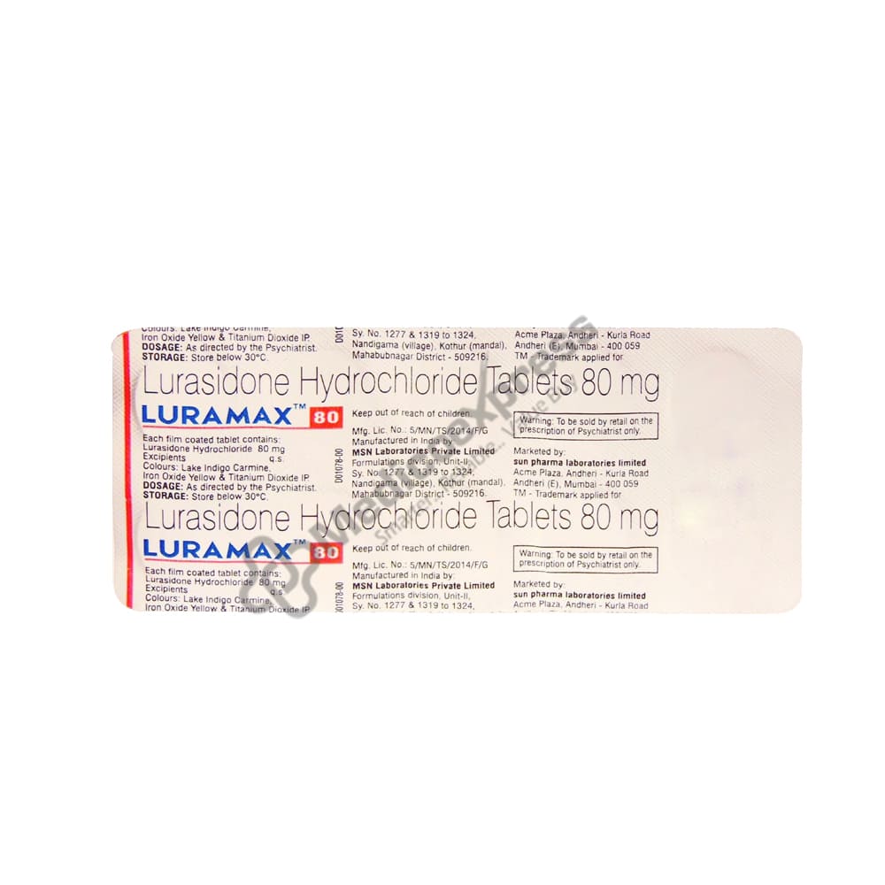 Luramax 80 Tablet 10 belongs to a class of medications known as 'antipsychotics.' It is used to treat schizophrenia (a condition that impairs a person's ability to feel, think, and behave clearly) and bipolar depression (mood swings).Disclaimer:For More Information Contact Your Physician