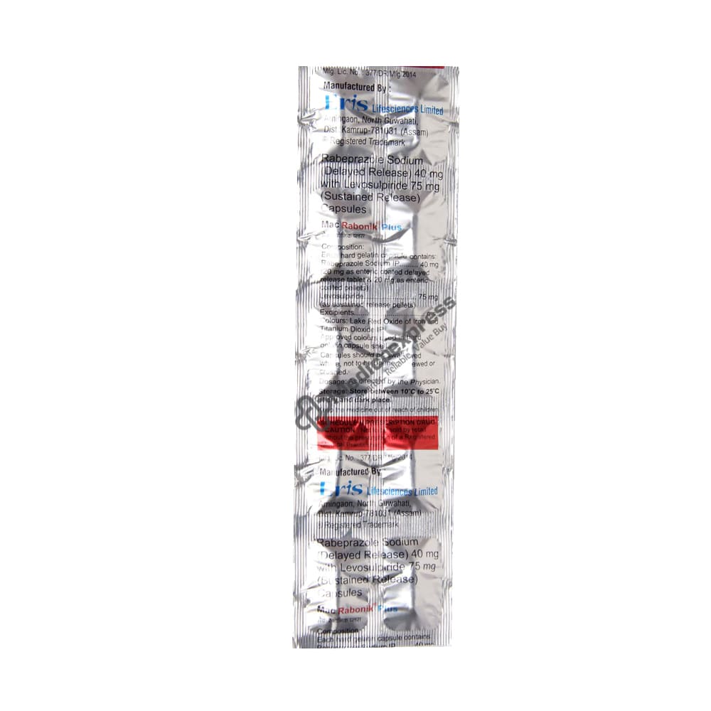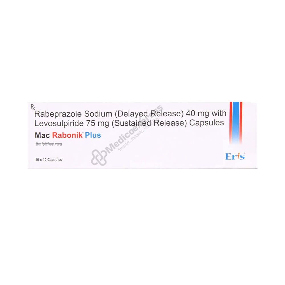 Mac rabonik plus capsule 10's are gastrointestinal drugs that are used to treat gastro-oesophageal reflux disease (gerd), acidity, heartburn, zollinger-ellison syndrome, helicobacter pylori infection, irritable bowel syndrome, indigestion, duodenal and gastric ulcers.Disclaimer:For more information contact your physician