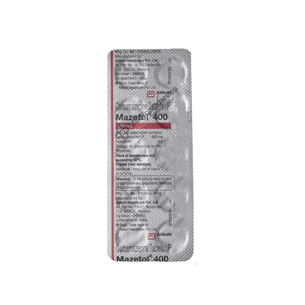 MAZETOL 400MG contains Carbamazepine, which belongs to the Anticonvulsant class of medications. It is used to treat epilepsy (fits or seizures) and trigeminal neuralgia (painful condition of the face). It can also be used to treat bipolar disorder symptoms if other medications are ineffective.Disclaimer:For More Information Contact Your Physician