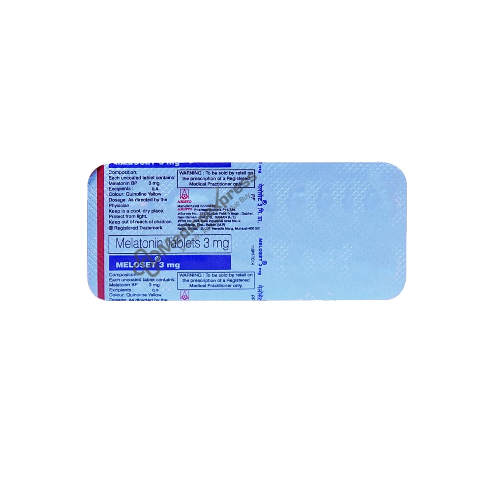 Meloset Tablet 10 is a hormone that aids in the regulation of sleep patterns. It is used to treat jet lag and sleep disorders (sleep disorders). Jet lag is a type of sleep disorder that occurs when people travel across multiple time zones. Insomnia is a sleep disorder characterised by difficulty falling and/or staying asleep. It contains the hormone melatonin, which helps to synchronise the body's biological day-and-night rhythm. It acts on the body's receptors, controlling the circadian rhythm and increasing the proclivity to sleep.Disclaimer:For More Information Contact Your Physician