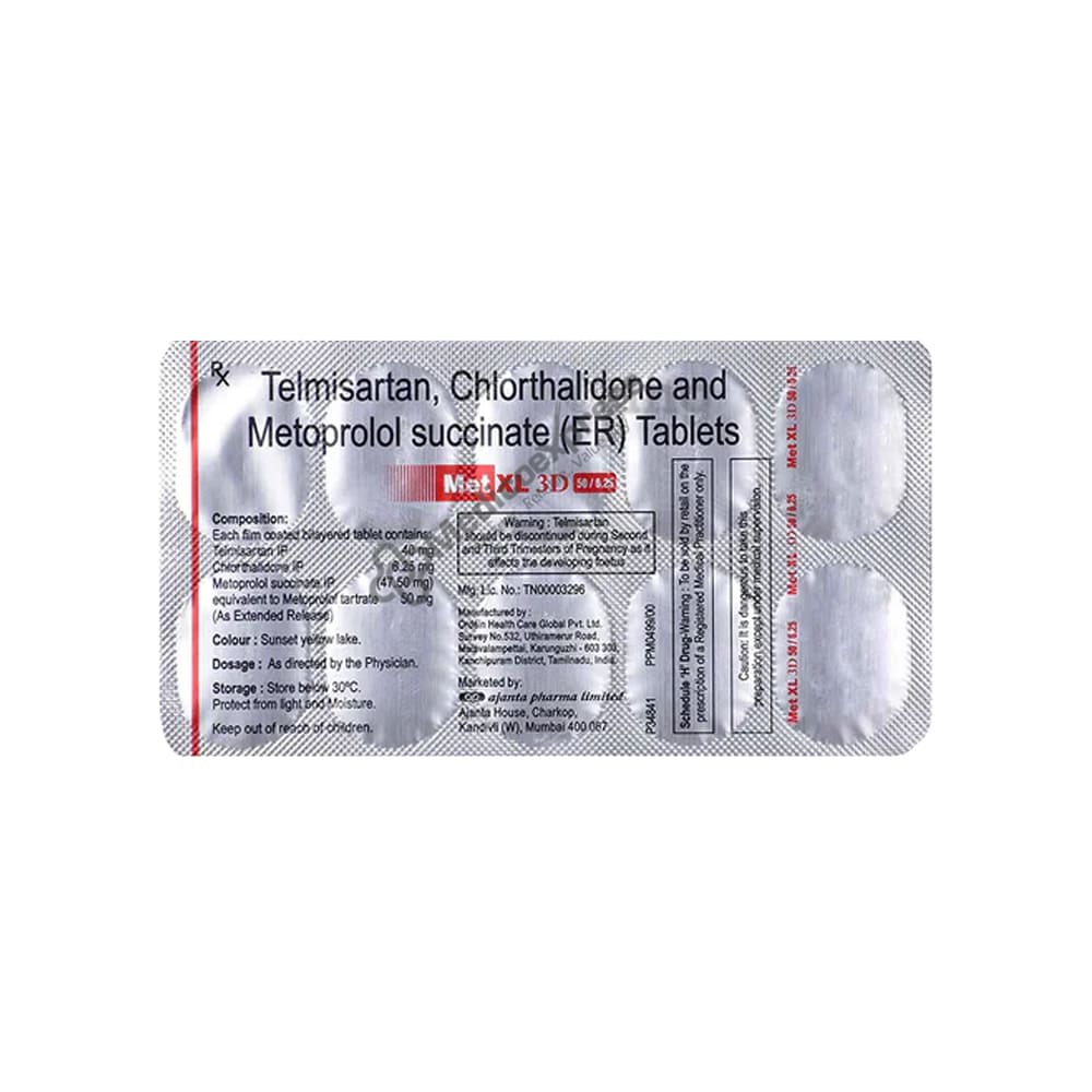 Met XL 3D 50/6.25 Tablet is a combination drug used to treat hypertension (high blood pressure). It works by relaxing the blood vessels and increasing the efficiency with which the heart pumps blood throughout the body. It also flushes the body of excess water and electrolytes.Disclaimer:For More Information Contact Your Physician