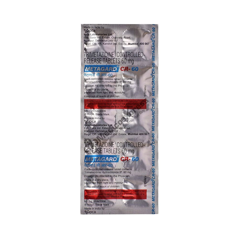 Metagard Cr-60 Tablet 10's a Heart-Related Medication That Contains Trimetazidine (Anti-Anginal Drug), Which Is Used In Adult Patients In Combination With Other Medications To Avoid An Attack Of Angina Pectoris (Chest Pain Caused By Coronary Disease).Disclaimer:For More Information Contact Your Physician