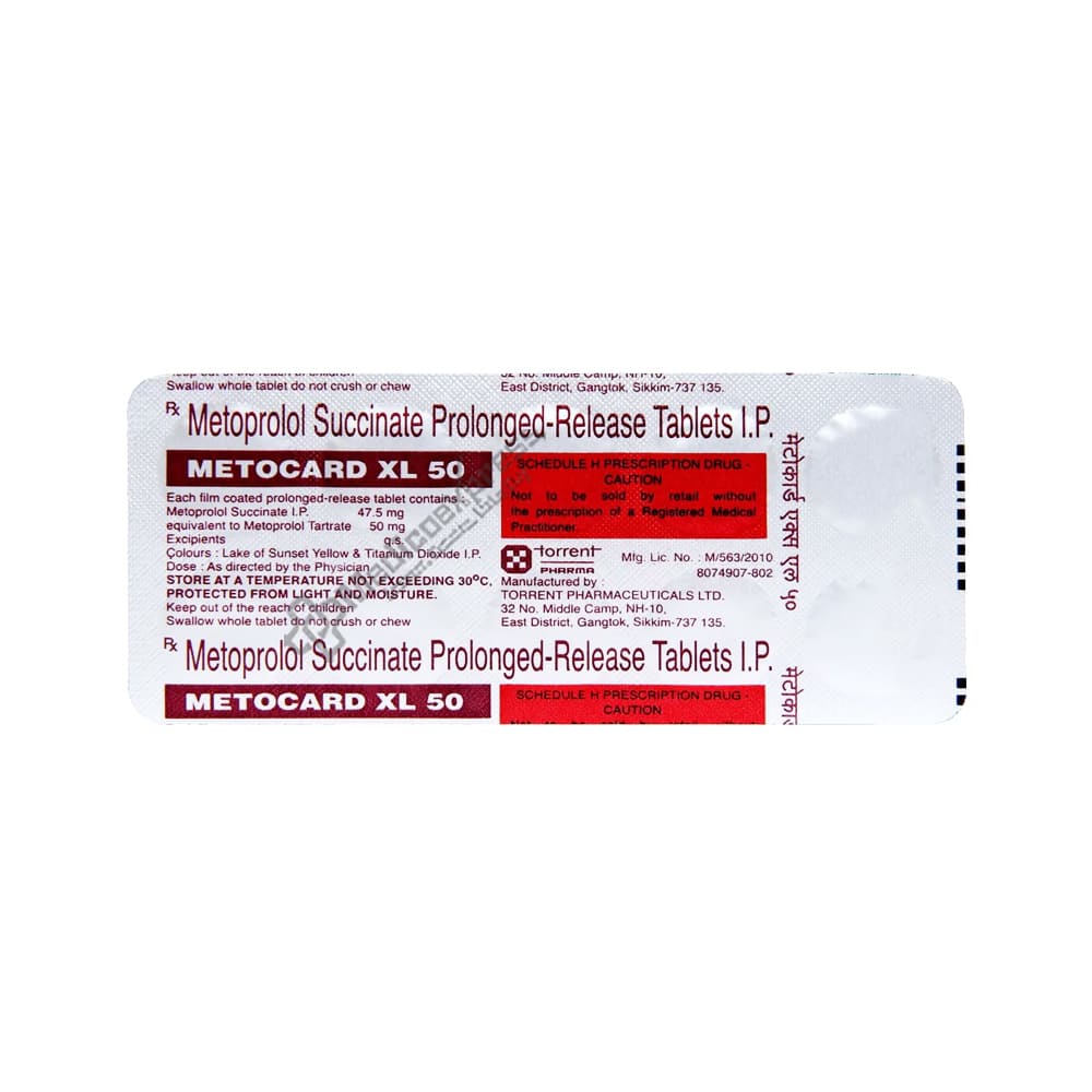 Metocard XL 50 Tablet belongs to a class of drugs known as beta-blockers. It is used to treat high blood pressure (hypertension), angina (chest pain caused by a heart condition), and irregular heart rhythms (arrhythmia). It also aids in the prevention of future heart attacks and strokes, as well as migraines.Disclaimer:For More Information Contact Your Physician