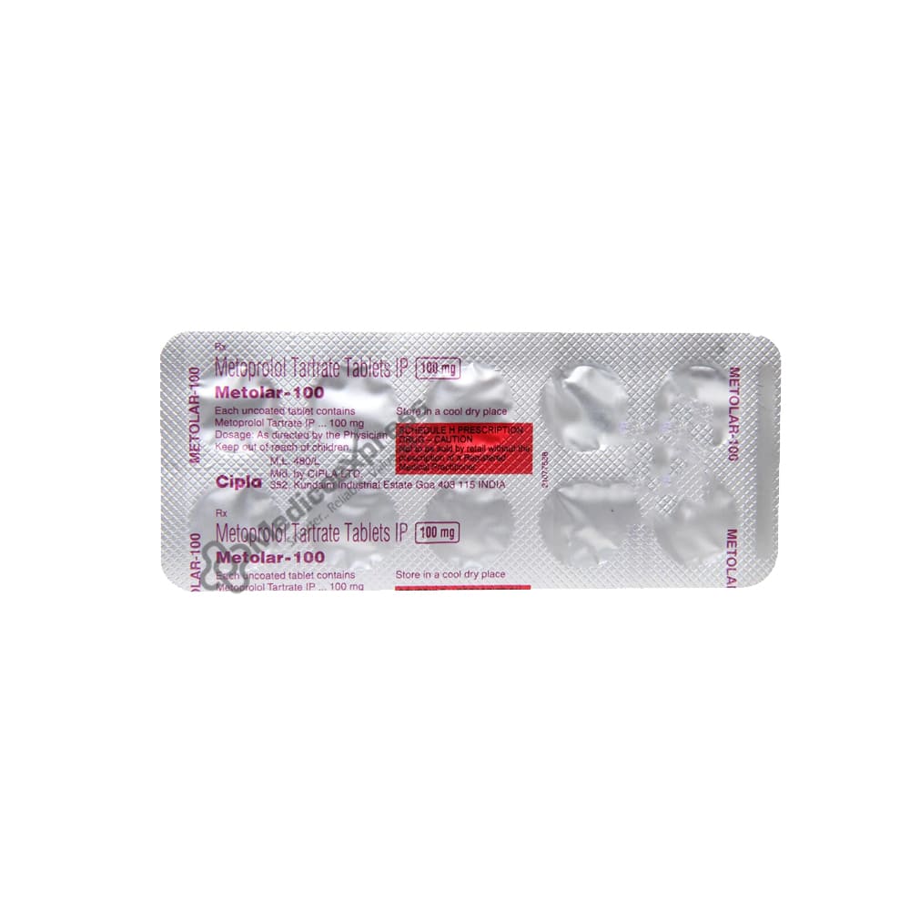 Metolar 100 Tablet 10 is a beta-blocker medication that is used to treat high blood pressure (hypertension), heart-related chest pain (angina), irregular heart rhythm (arrhythmia), and to protect the heart after a heart attack (myocardial infarction).Disclaimer:For More Information Contact Your Physician
