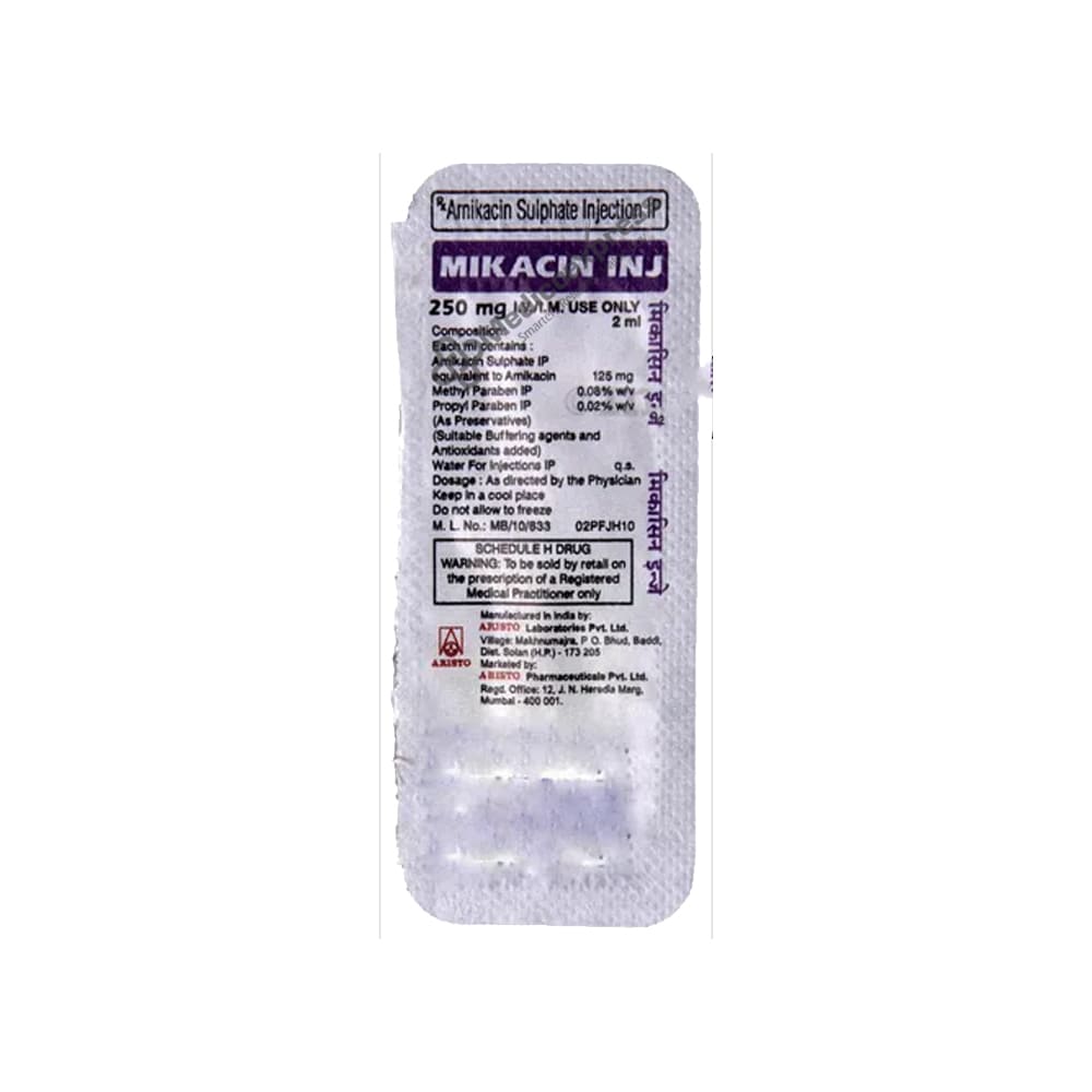 MIKACIN 250MG INJECTION includes Amikacin, a medication in the Aminoglycoside Antibiotic class. It is used to treat serious infections caused by amikacin-sensitive bacteria, such as respiratory tract and lung infections, gastrointestinal infections, inflammation of the inner lining of the heart, infected burns, and blood bacterial infections.Disclaimer : For More Details, Contact Your Physician