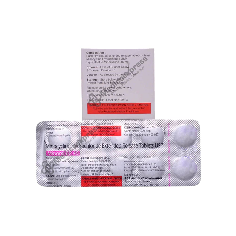 Minonil ER 45 Tablet 10 belongs to a class of medications known as tetracycline antibiotics, which are used to treat a variety of bacterial infections. It treats a variety of infections, including urinary tract infections, intestinal infections, respiratory infections, sexually transmitted infections (such as gonorrhoea and syphilis), skin infections, and others.Disclaimer:For More Information Contact Your Physician