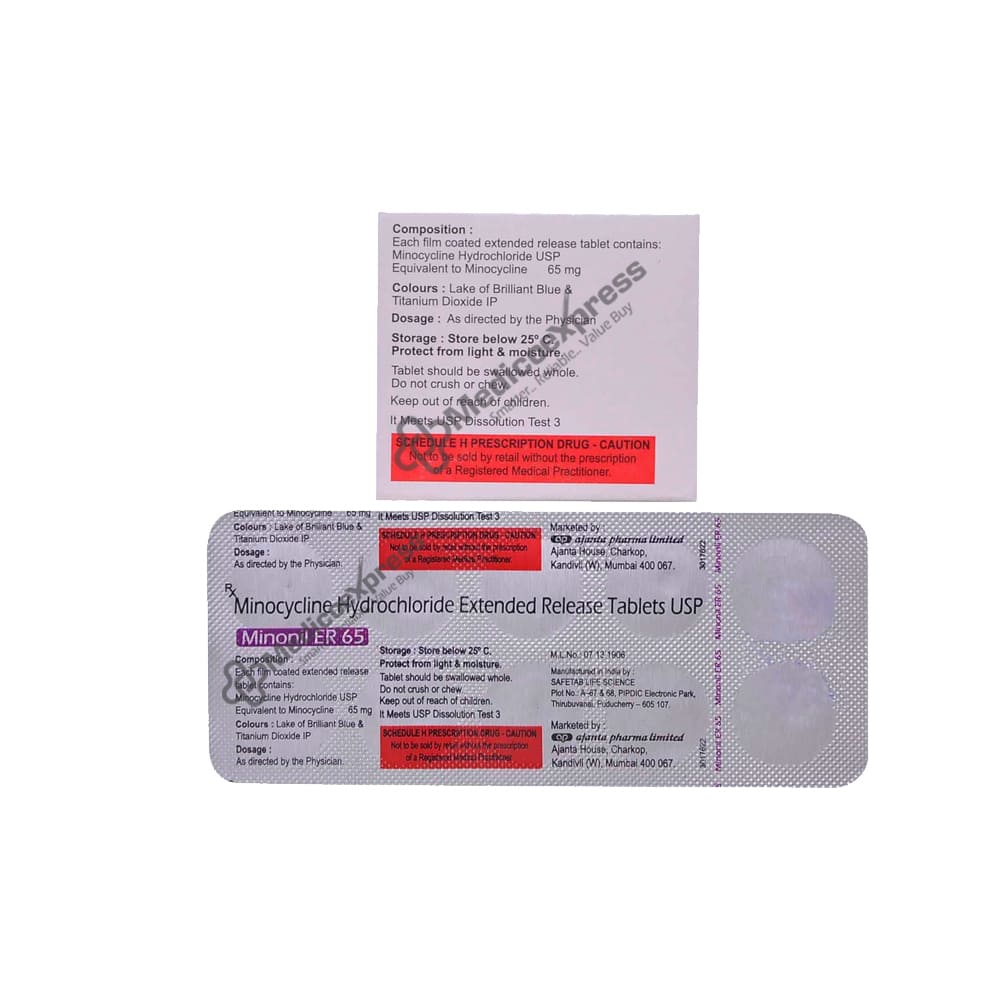 Minonil ER 65 mg Tablet 10s, are used to treat a variety of bacterial illnesses. Sexually transmitted infections (such as gonorrhoea and syphilis), skin infections, intestinal infections, respiratory infections, and other conditions are all treated by Minonil ER 65 Tablet 10. Minonil ER 65 Tablet 10's also treats rosacea-related lesions that resemble acne. An infection brought on by bacteria growing inside the body is known as a bacterial infection. Any bodily component can be the target, and it multiplies very quickly. When used to treat these types of infections, antibiotics prevent the growth of germs. The antibiotic minocycline is found in Minonil ER 65 Tablets 10 and is primarily used to treat a variety of bacterial illnesses caused by gram-negative, gram-positive, anaerobic, and other bacteria.Disclaimer:For more information contact your physician.