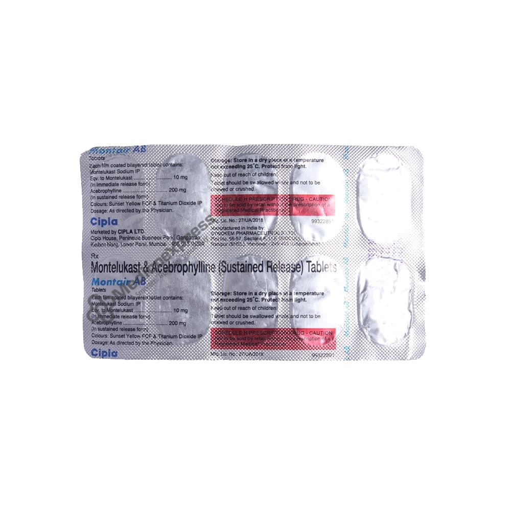 Montair Ab Tablet 10'S is a respiratory medication used to treat and prevent respiratory conditions such as asthma attacks, chronic obstructive pulmonary disease (COPD), and allergic rhinitis (hay fever).Disclaimer:For More Information Contact Your Physician
