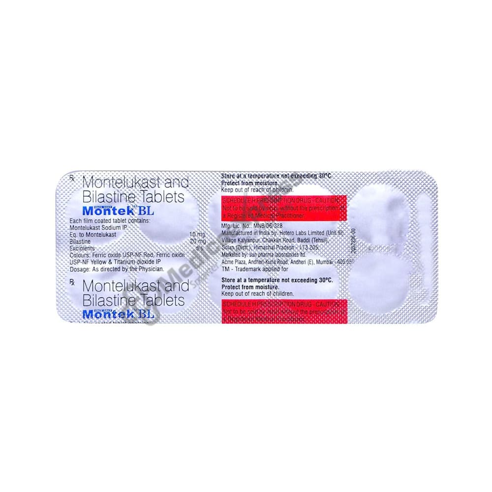 Montek BL Tablet contains two medications. It is used to treat a variety of allergic conditions. By inhibiting certain chemical messengers in the body, it reduces inflammation (redness, tenderness, heat, and swelling), itching, and rashes.Disclaimer:For More Information Contact Your Physician