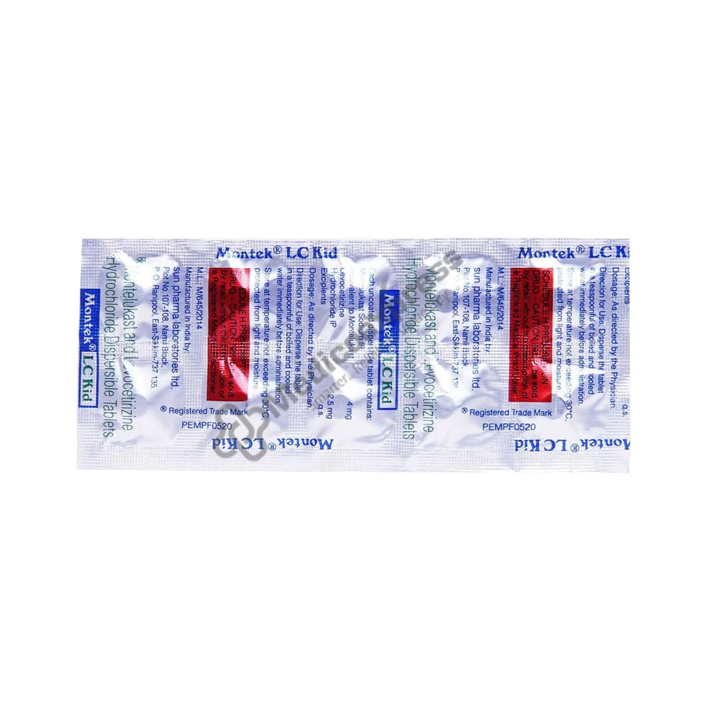 MONTEK LC KID is a combination of the medications Levocetirizine and Montelukast, which are classified as H1 receptor antagonists and Leukotriene receptor antagonists, respectively. In adults and adolescents, MONTEK LC KID is indicated for the treatment and prevention of allergic rhinitis, chronic idiopathic urticaria (allergic skin reaction with red raised itchy bumps on skin), and bronchial asthma (aged 15 years or above).Disclaimer:For More Information Contact Your Physician