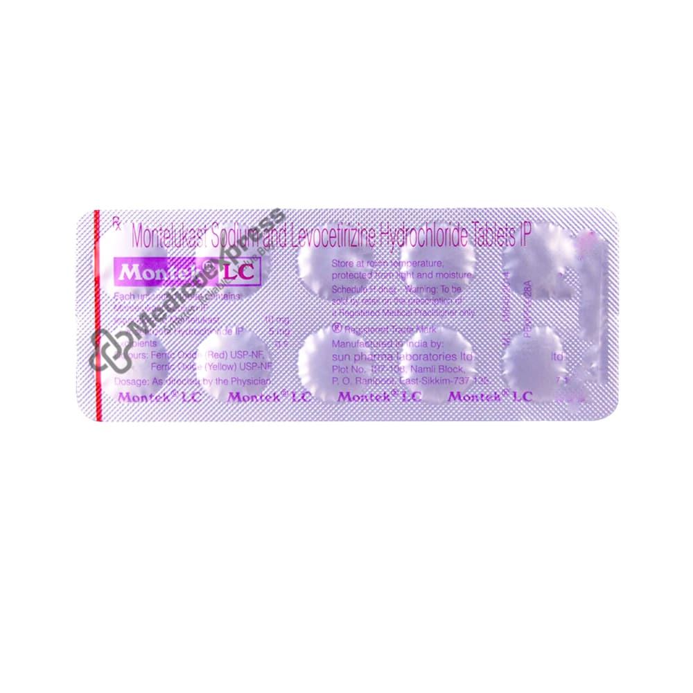Montek Lc Tablet 10's Tablets Is a Mixture Of Anti-Allergic Treatments That Includes Two Medications: Levocetirizine And Montelukast, Which Are Primarily Used To Treat Allergic Symptoms. Levocetirizine Inhibits The Effects Of a Chemical Messenger Known As 'Histamine,' Which Is Naturally Implicated In Allergic Reactions.Disclaimer:For More Information Contact Your Physician