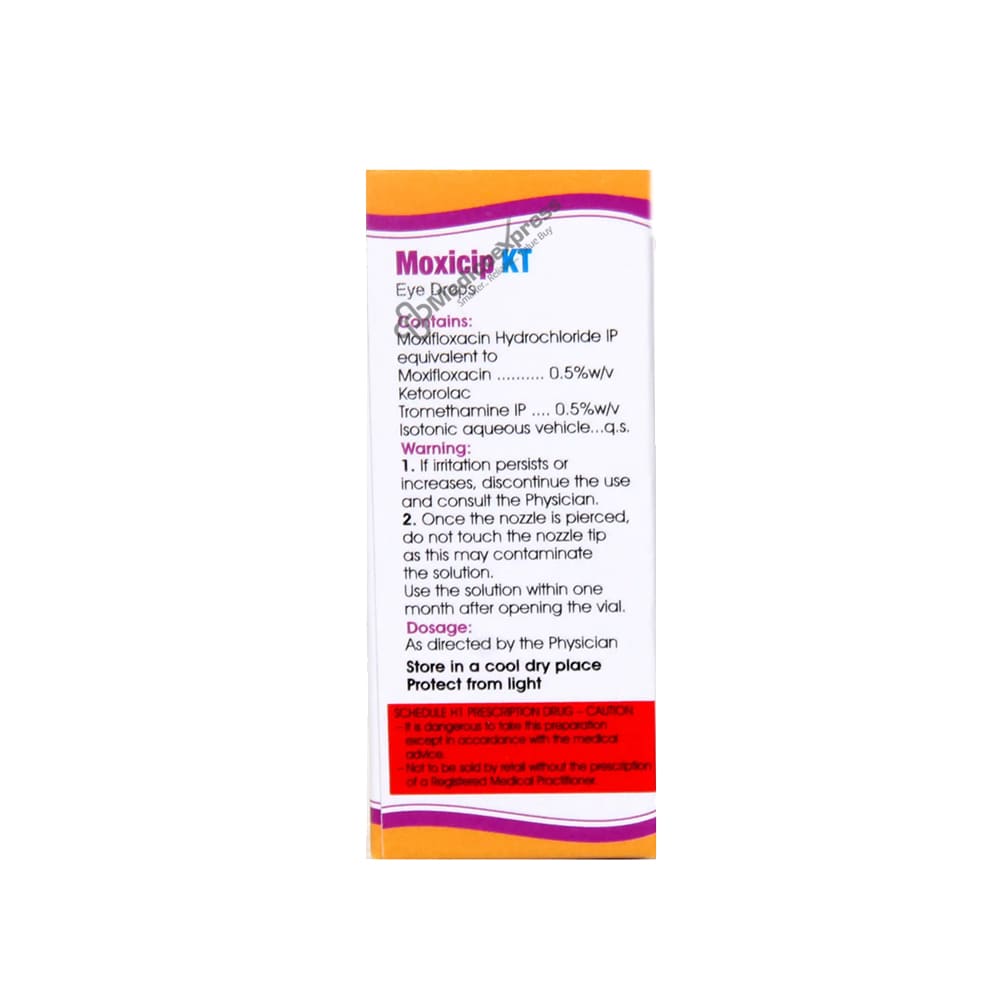 Moxicip KT Eye Drop contains two medications. It is employed in the treatment of eye infections. It inhibits the growth of the microorganisms that cause infection. This alleviates the infection's pain, itching, inflammation, discomfort, and irritation.Disclaimer:For More Information Contact Your Physician