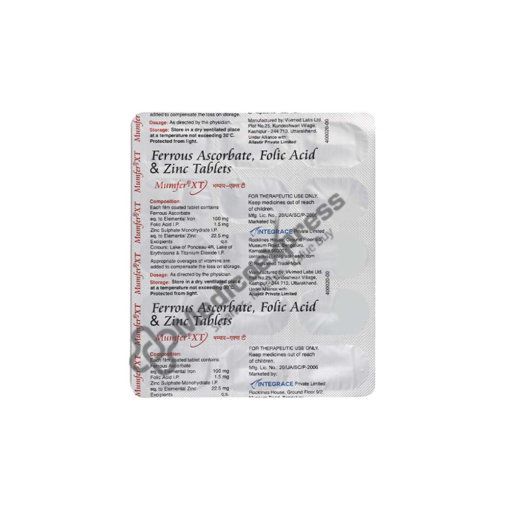 Mumfer XT Tablet 15's is a combination drug that is classified as a "hematinic." It is primarily used to prevent and treat low blood levels of folic acid, zinc, and iron when certain medical conditions are present (e.g., anaemia, pregnancy, low diet, surgery recovery). When the body produces fewer red blood cells or haemoglobin than normal, a disease known as anaemia develops (an iron-rich protein responsible for allowing red blood cells to carry more oxygen from the lungs to the rest of the body). The body requires extra zinc, iron, and folic acid during pregnancy, and deficiency in these nutrients can cause anaemia in both the mother and the foetus.Disclaimer:For more information contact your physician.