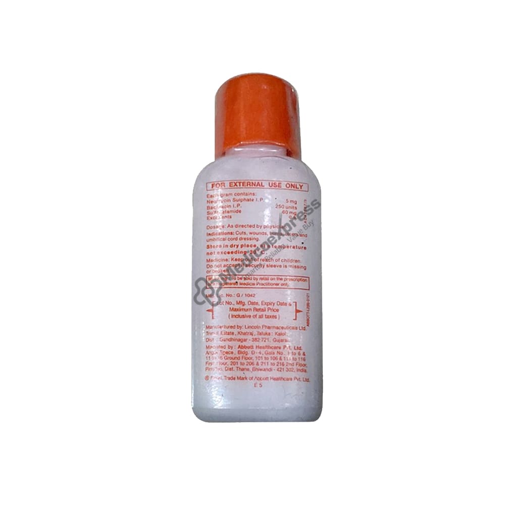 Nebasulf Sprinkling Powder 10 gm is a component of an antibiotic drug class that is generally used to treat bacterial skin infections brought on by wounds, scrapes, ulcers, burns, and umbilical cord dressing. When harmful bacteria build up inside the body, it results in bacterial infection. It spreads swiftly and can attack any area of the body. The 10 gm Nebasulf Sprinkling Powder is ineffective against bacterial, viral, and fungal diseases. Three antibiotics—Neomycin, Bacitracin, and Sulfacetamide—are combined in Nebasulf Sprinkling Powder 10 gm. Neomycin prevents bacterial development by stopping the creation of vital proteins that are required for bacteria to grow, reproduce, and become more numerous.Disclaimer:For more information contact your physician.