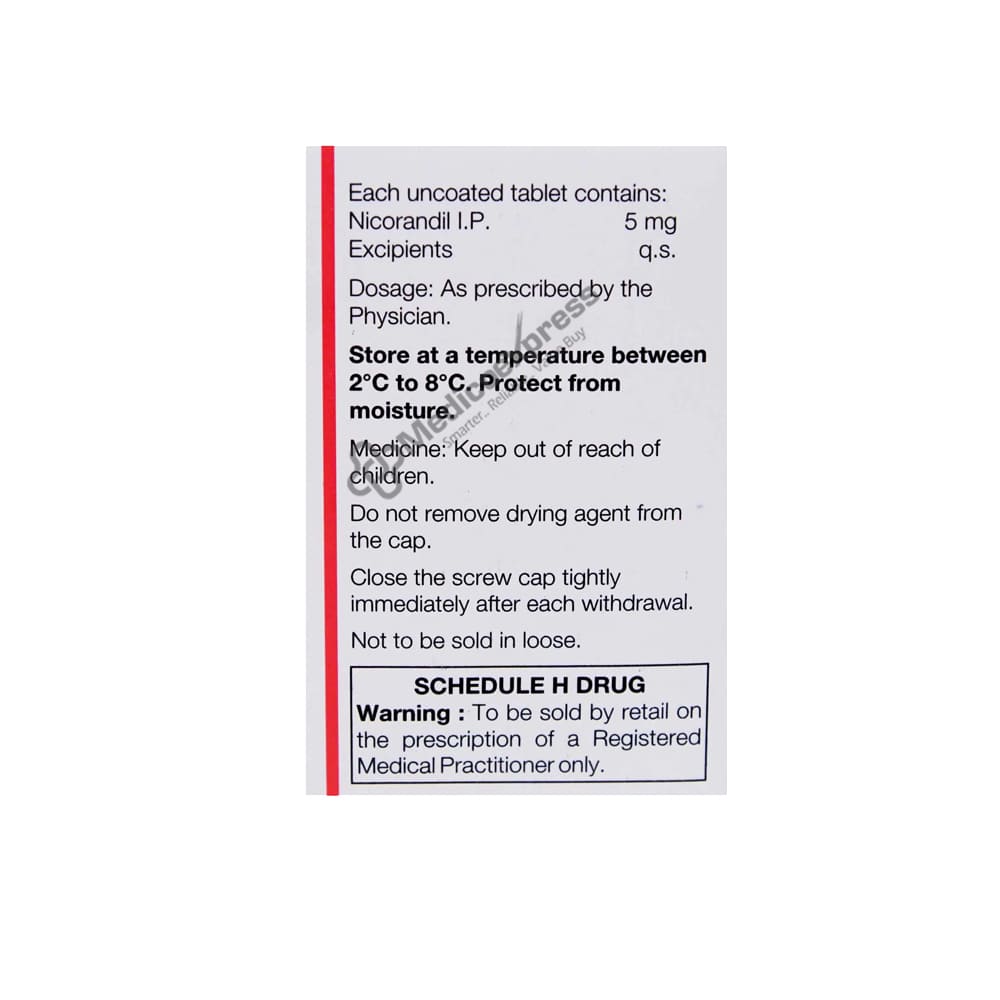 Nicoduce 5 mg Tablet 20's is a member of the 'vasodilators' class of drugs used to treat or prevent angina pectoris (chest discomfort associated with the heart) in individuals who are unable to take beta-blockers (blood pressure-lowering pills). Reduced blood supply to the heart causes a specific type of chest pain known as angina pectoris. It represents a sign of coronary artery disease. Nicorandil, an activator of potassium channels, is found in Nicoduce 5 Tablet 20s. It relaxes the blood vessel's muscle cells and widens blood vessels by opening potassium channels on these cells. By making it simpler for the heart to pump blood throughout the body and requiring less oxygen, Nicoduce 5 Tablet 20's lessen the workload on the heart.Disclaimer:For more information contact your physician.