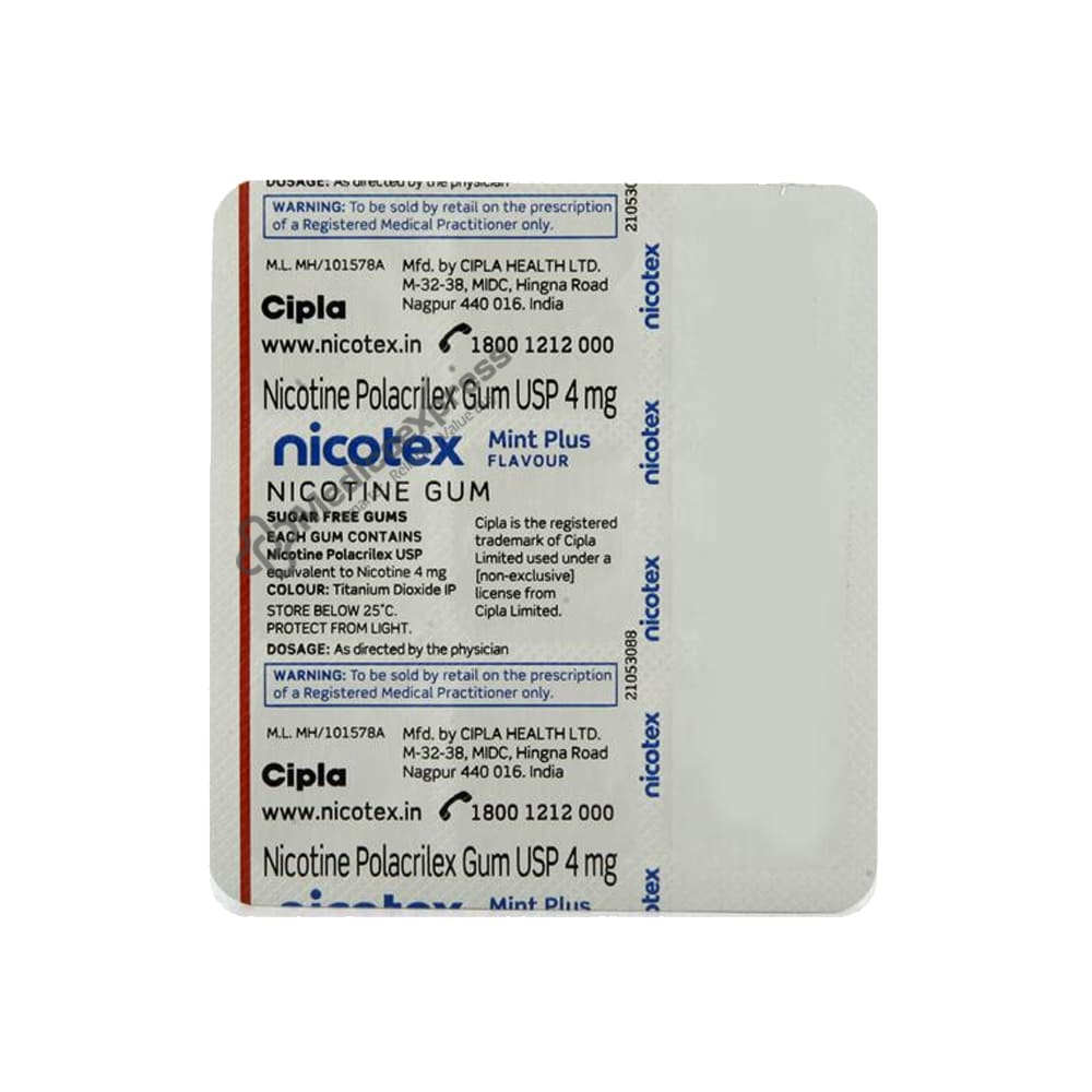 NICOTEX ULTRA MINT FLAVOUR SUGAR FREE 4MG contains Nicotine, which belongs to the class of medications known as Smoking Cessation Aids. It is used to help people stop smoking. It both prevents and alleviates withdrawal symptoms in people who want to quit smoking. It also reduces smoking cravings when you try to cut back on the number of cigarettes you smoke per day.Disclaimer:For More Information Contact Your Physician