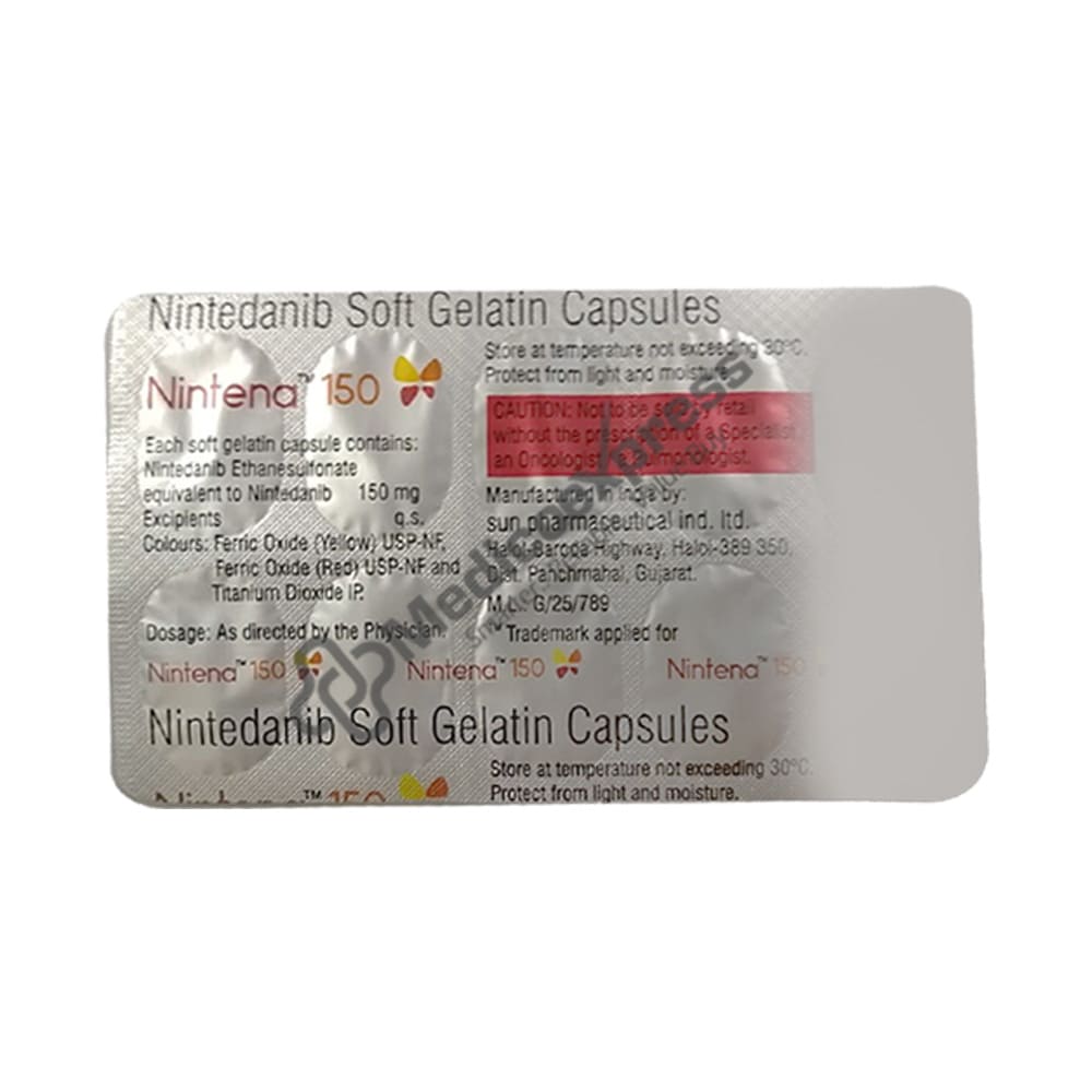 Nintena 150 Soft Gelatin Capsule 10's is a 'anti-fibrotic medicine' that is primarily used to treat adults with idiopathic pulmonary fibrosis (IPF). IPF is an irreversible disease characterised by a gradual decline in lung function. Over time, the tissues in the lungs swell and scar, making it difficult to breathe deeply. The scarring makes it difficult for the lungs to function properly.Disclaimer:For More Information Contact Your Physician