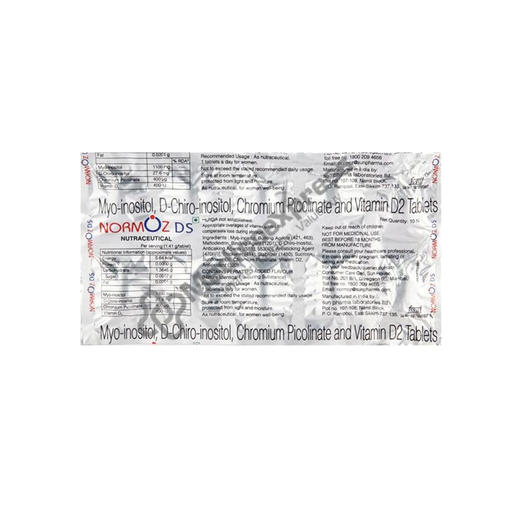 Normoz DS Tablet is a dietary supplement that contains essential vitamins. Chromium picolinate, D-chiro-inositol, Myo-inositol, and Vitamin D2 make up this supplement. It is used to treat a variety of conditions such as chromium deficiency, metabolic syndrome, and polycystic ovary syndrome (PCOS).Disclaimer:For More Information Contact Your Physician