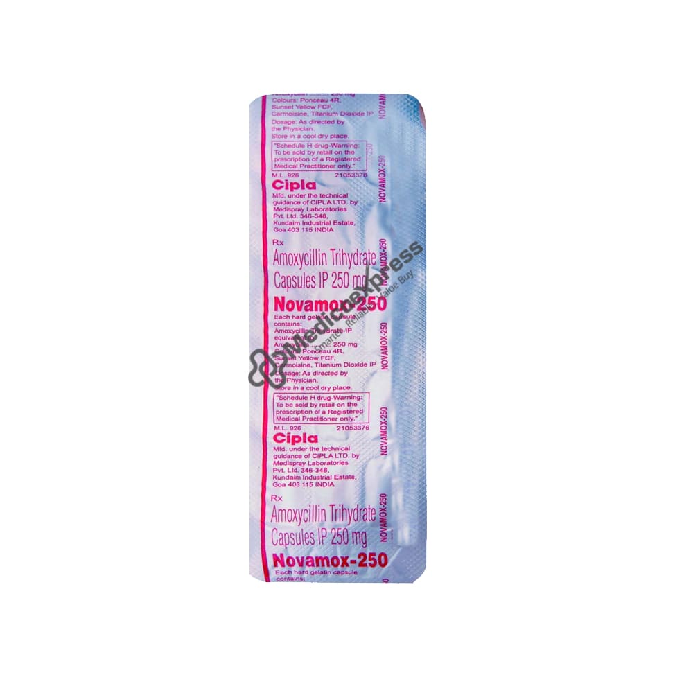 Novamox 250 Capsule is an antibiotic that is used to treat a variety of bacterial infections. It works well for infections of the throat, ear, nasal sinuses, respiratory tract (including pneumonia), urinary tract, skin and soft tissue, and typhoid fever.Disclaimer:For More Information Contact Your Physician