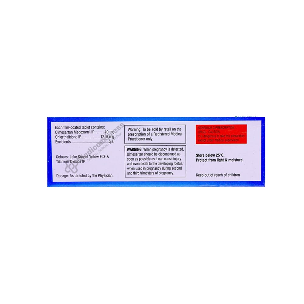 Olkem-40 mg CT Tablet 10s, is primarily used to treat high blood pressure. A persistent illness known as hypertension or high blood pressure causes a strong force of blood against the arterial wall. As a result, it causes issues like irregular pulse and cardiac disorders. Olmesartan medoxomil and chlorthalidone are the two medications included in one tablet, Olkem-40 CT Tablet 10s. Olmesartan medoxomil is an angiotensin receptor blocker (ARB), which relaxes blood arteries by inhibiting the hormone angiotensin. This makes the heart's pumping action more effective and the blood flow more smoothly. Chlorthalidone is a diuretic, sometimes known as a water pill, that helps the body get rid of surplus water and some electrolytes. Disclaimer:For more information contact your physician.