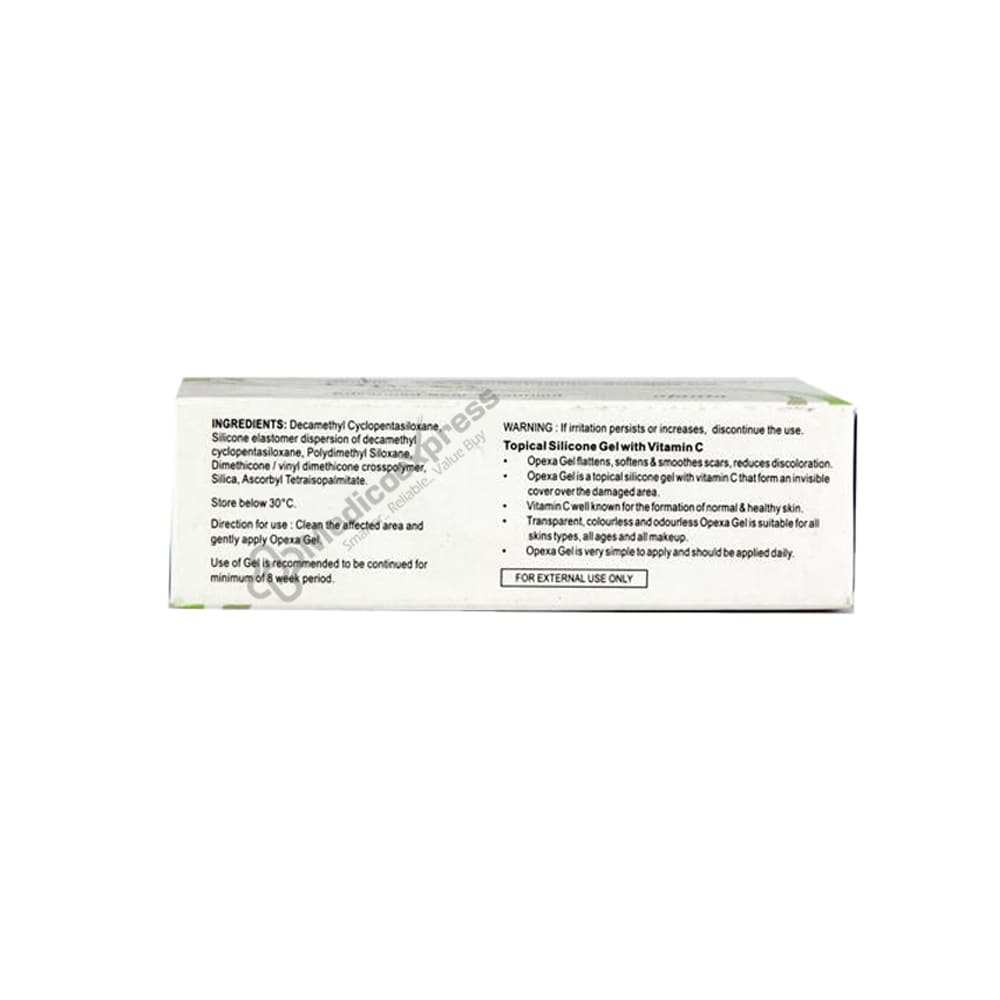 Opexa Gel is a topical silicone gel containing vitamin C that forms an invisible covering over the affected area. It flattens, softens, and smoothes scars while also reducing discoloration. Vitamin C is well known for its role in the development of normal and healthy skin.Disclaimer:For More Information Contact Your Physician