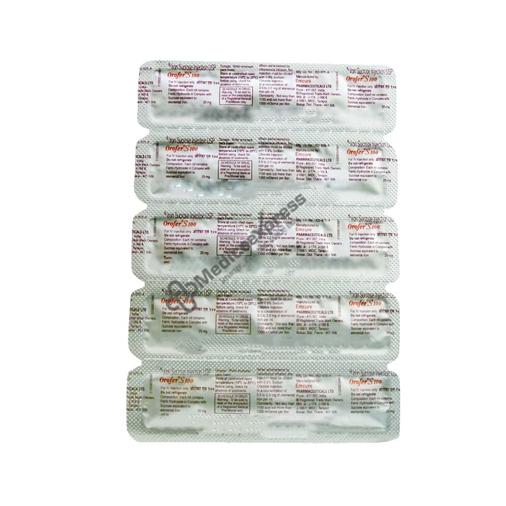 Orofer s 100 injection 5 ml is a 'iron replacement product,' which is primarily used to treat iron deficiency anaemia in persons with chronic kidney disease.Disclaimer:For more information contact your physician