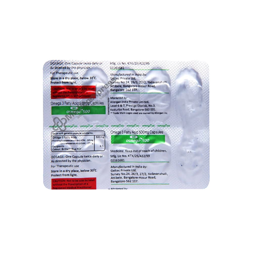 Omega-500 Capsule 10s are a member of the class of dietary supplements used to reduce elevated triglyceride levels, the risk of coronary heart disease, and to support the development and maintenance of a healthy body. It is used as an adjuvant in the treatment of arthritis, age-related macular degeneration, dry eye disease, Alzheimer's disease, cognitive function, and newborn health and development. It is also used to prevent cancer.Disclaimer:For more information contact your physician.