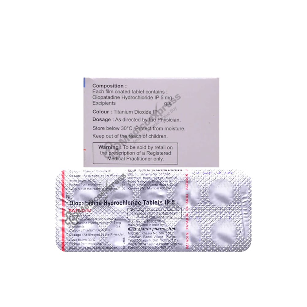 Patadin 5mg Tablet 10'S is a member of the class of drugs known as mast cell stabilisers. Hives, which are raised red spots of skin, allergic rhinitis, and itching brought on by skin conditions are all conditions it is used to treat. When inhaled allergenic particles come into touch with the mucous membranes of the nose and cause a reaction mediated by antibodies, allergic rhinitis results (IgE). Clear nasal fluid, sneezing, nasal congestion, allergic eye irritation, itchy eyes, ears, and nose are among the symptoms. Olopatadine functions by preventing the release of histamine, which is responsible for promoting inflammatory reactions including allergies, and stabilising certain inflammatory cells.Disclaimer:For more information contact your physician.