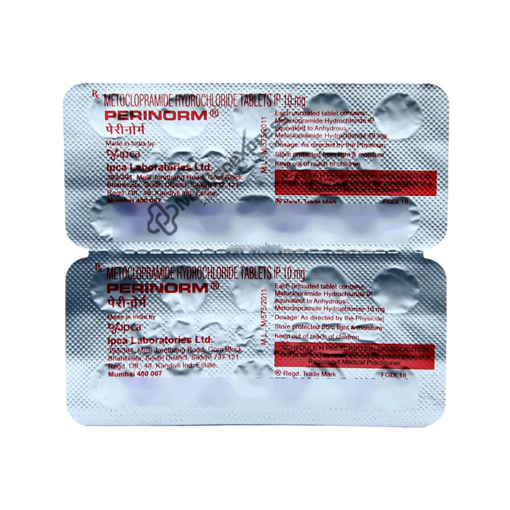 Perinorm tablet 10's an anti-emetic medication that is used to prevent nausea and vomiting caused by chemotherapy, radiotherapy, and migraine.Disclaimer:For more information contact your physician