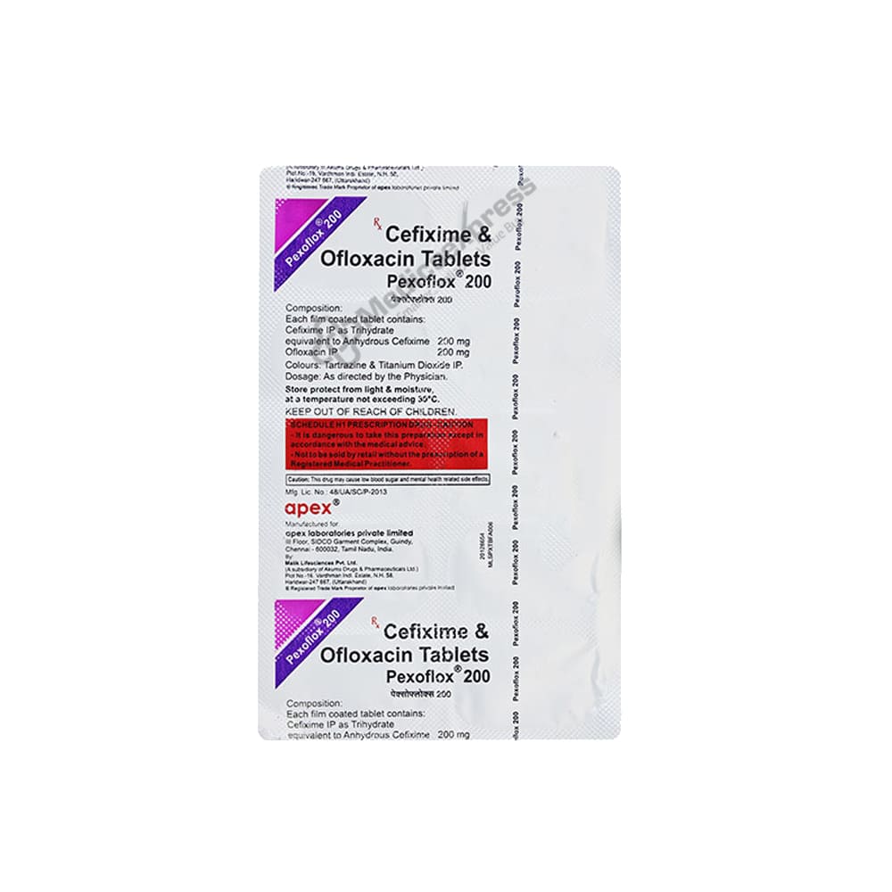 Pexoflox 200 mg/200 mg Tablet is a combination medication used to treat different bacterial infections. To stop the growth and further spread of the infection, it battles the germs.Disclaimer:For more information contact your physician.
