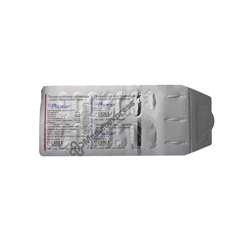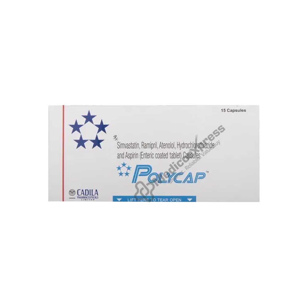 Polycap Capsule 15's is used to stop heart attacks and strokes. Additionally, it aids in lowering cholesterol levels, regulating blood pressure, and preventing clot formation. To prevent frequent urination at night, Polycap Capsule should be taken with or without breakfast, especially in the morning. As directed by your doctor's regimen, you should take it consistently at regular intervals. You'll be more likely to remember to take it if you take it at the same time each day. The type of treatment you are receiving will determine the dosage and time frame. Even when you feel better, keep taking it until you have completed the entire course. A low-fat diet, regular exercise, and quitting smoking may improve the effectiveness of this medication.Disclaimer:For more information contact your physician.
