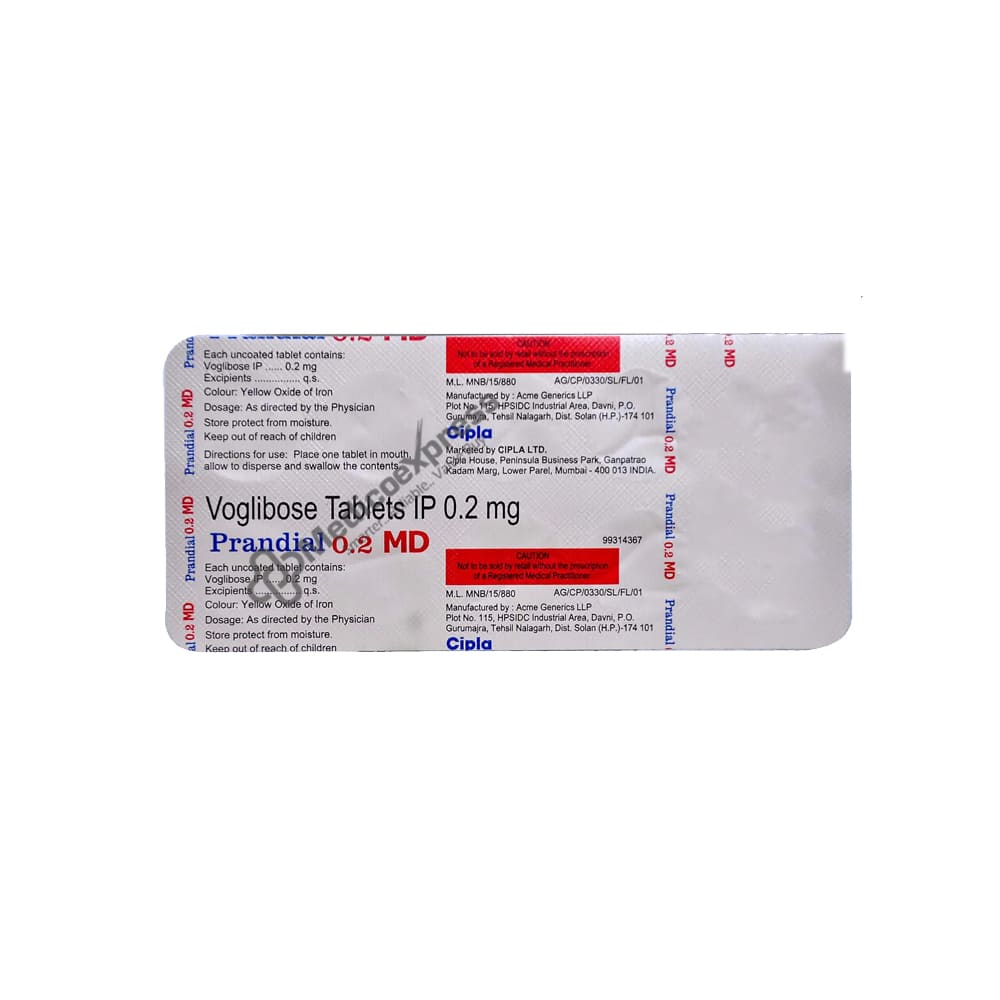 PRANDIAL MD 0.2MG TABLET contains Voglibose, a medication in the Anti-diabetics class. It is used in the treatment of type 2 diabetes mellitus, along with diet and exercise, to improve post-prandial blood glucose levels (when diet and/or exercise alone, or oral hypoglycemic drugs or insulin preparation in addition to diet and/or exercise, do not result in adequate glycemic control).Disclaimer:For More Information Contact Your Physician